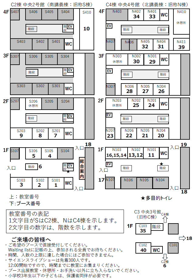 - サイエンスライブショーは12時開始です。ご希望の方は、余裕を持って会場にお越しください。